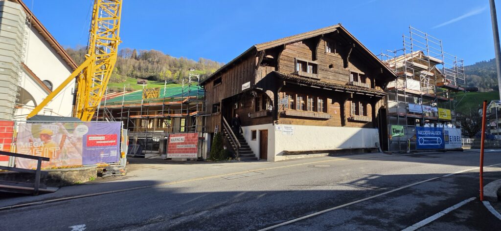 In der Woche nach Ostern wurde in Illgau der Rohbau des «Sigristenhaus»-Saales aufgerichtet. Somit sind die neuen Dimensionen des einzigen Dorfrestaurants nach dem Um- und Neubau gut ersichtlich. Links der neue, geräumige Saal, in der Mitte das alte, geschützte Sigristenhaus und rechts das neue «Dörflihaus». Gemäss Auskunft des Verwaltungsrates der Sigristenhaus AG wird nach wie vor nach Wirtsleuten gesucht.