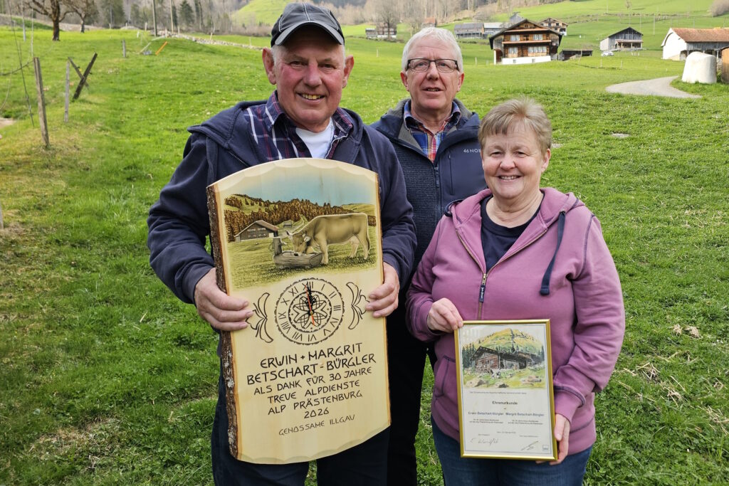 Sebi Heinzer, der Präsident der Genossame Illgau (hinten), ehrte Erwin und Margrit Betschart-Bürgler für „30 Jahre treue Alpdienste auf der Alp Prästenburg». Bild: Guido Bürgler